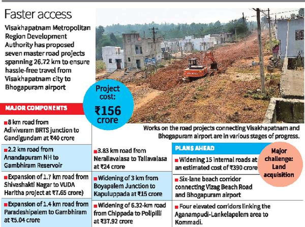 The seven roads are being constructed at an estimated price of Rs. 156 crore, together with CSR funds from the company firms. These roads embrace: An 8 km street from Adivivaram BRTS junction to Gandigundam (Rs. 40 crore), awaiting forest clearance; a 2.2 km street from Anandapuram NH to Gambhiram Reservoir, a 1.7 km growth from Shivashakti Nagar to the VUDA Haritha venture (Rs. 7.65 crore); a 1.4 km growth from Paradeshipalem to Gambhiram (Rs. 5.04 crore); a 3.83 km street from Nerallavalasa to Tallavalasa (Rs. 24 crore); a 3 km widening from Boyapalem Junction to Kapuluppada (Rs. 15 crore); widening of 6.32-km street from Chippada to Polipilli (Rs. 37.92 crore).