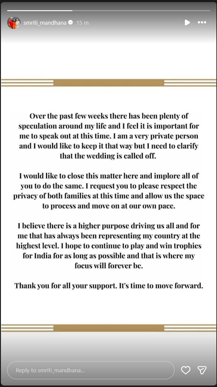 Star Indian cricketer Smriti Mandhana has lastly damaged her silence on the rumors surrounding her private life. She has reportedly referred to as off her marriage ceremony plans following allegations linking her fiancé to dishonest rumors with Palash Muchhal. The batter has chosen to prioritize her profession and peace of thoughts because the scenario continues to attract public consideration.